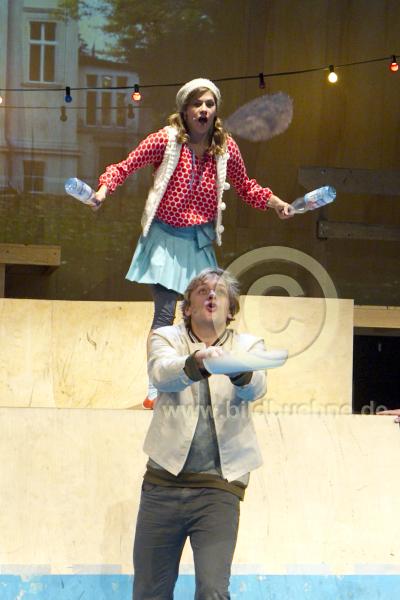 Titel: Puenktchen trifft Anton. Autor: Volker Ludwig nach Erich Kaestner. Ort: Grips Theater Berlin. Regie: Frank Panhans. Ausst.: Jan A. Schroeder, Maria- Alice Bahra. No model release. Copyright: david baltzer/bildbuehne.de. UA: 26. November 2011.