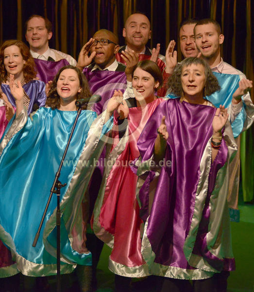 Ort: Sophiensaele. Bernadette La Hengst. Titel: BEDINGUNGSLOSES GRUNDEINSINGEN. Premiere: 28.03.2013. Kuenstlerische Leitung, Musik, Gesang: Bernadette La Hengst, Godehard Giese, Bettina Grahs, Claudia Wiedemer und Chor. Buehne, Kostueme: Jelka Plate, Eike Boettcher.