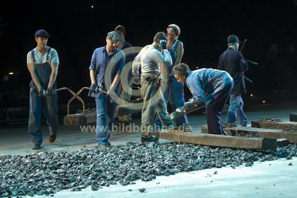 Titel: Der Streik. Nach: Ayn Rand, Bearbeitung Jens Gross. Ort: Schauspiel Koeln / Depot 1. Regie: Stefan Bachmann. Buehne: Simeon Meier. Kostueme: Annabelle Witt. No model release. Copyright: david baltzer/bildbuehne.de. Premiere: 12. Oktober 2013. Darst.: Ensemble: Nikolaus Benda, Larissa Aimee Breidbach, Nicola Gruendel, Christian Hockenbrink, Gerrit Jansen, Simon Kirsch, Niklas Kohrt, Melanie Kretschmann, Guido Lambrecht, Sean McDonagh, Joerg Ratjen, Martin Reinke, Torsten Peter Schnick und Birgit Walter u.a..