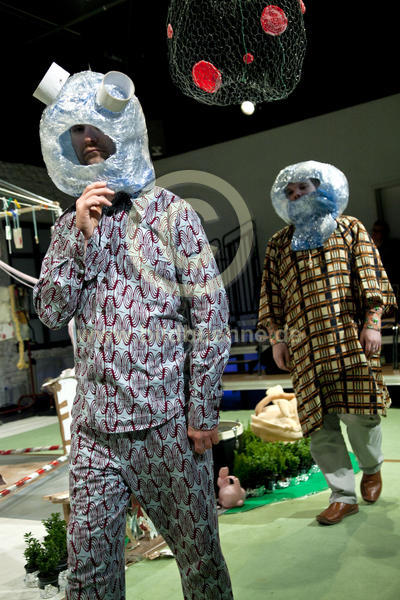 Titel: Der Diskrete Schwarm der Bourgeoisie. Autor: nach dem Film von Luis Bunuel. Konzept, Regie: Anne Tismer. Buehne: Anne Tismer, Isolde Wittke. Kostueme: Vicky Ajavon, Heike Braitmayer. No model release. Copyright: david baltzer/bildbuehne.de. Ort: Thikwa Berlin. UA: 23. Januar 2014. Darst.: Max Edgar Freitag und Benjamin Gallasch u.a..
