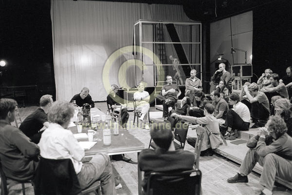 Vollversammlung der Sparte Schauspiel in der ersten neuen Saison unter der Intendanz Ostermeier / Walz - an der Schaubuehne am Lehniner Platz. No model release. Copyright: david baltzer/bildbuehne.de. Montag, 27. September 1999. Am Tisch vorne rechts Jens Hillje und hinten Thomas Ostermeier.