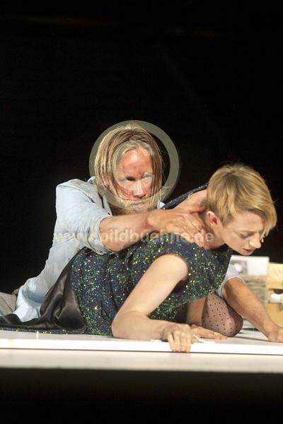 Titel: Dogville. Autor: nach dem Film von Lars von Trier. Regie: Bastian Kraft. Buehne: Peter Baur. Kostueme: Inga Timm. Ort: Schauspiel Koeln im Carlswerk / Depot 1. Premiere: 5. September 2014. No model release. Copyright: david baltzer/bildbuehne.de. Darst.: Katharina Schmalenberg / Grace und Nikolaus Benda / Chuck u.a..