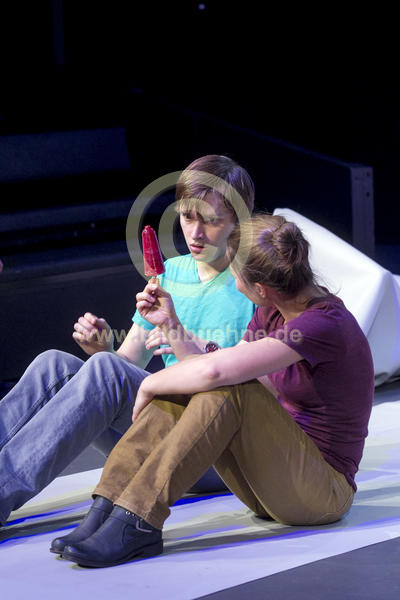 Titel: Supergute Tage - die sonderbare Welt des Christopher Boone. Autor: Mark Haddon, Buehnenfassung Simon Stephens. Regie: Barbara Hauck. Ausst.: Jan A. Schroeder. Video: Silke Pielsticker. Ort: Grips Theater Berlin. Premiere: 7. November 2014. No model release. Copyright: david baltzer/bildbuehne.de. Darsteller: Kilian Ponert / Christopher und Regine Seidler / Judy Mutter u.a..