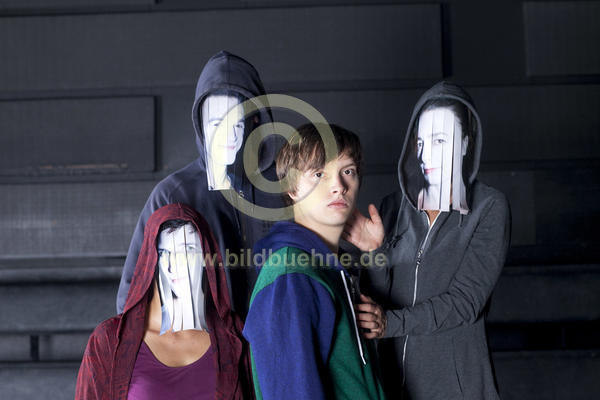 Titel: Supergute Tage - die sonderbare Welt des Christopher Boone. Autor: Mark Haddon, Buehnenfassung Simon Stephens. Regie: Barbara Hauck. Ausst.: Jan A. Schroeder. Video: Silke Pielsticker. Ort: Grips Theater Berlin. Premiere: 7. November 2014. No model release. Copyright: david baltzer/bildbuehne.de. Darsteller: Alessa Kordeck / Siobhan, Jens Mondalski / Ed Vater, Kilian Ponert / Christopher und Regine Seidler / Judy Mutter u.a..