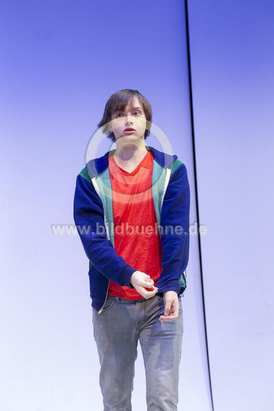 Titel: Supergute Tage - die sonderbare Welt des Christopher Boone. Autor: Mark Haddon, Buehnenfassung Simon Stephens. Regie: Barbara Hauck. Ausst.: Jan A. Schroeder. Video: Silke Pielsticker. Ort: Grips Theater Berlin. Premiere: 7. November 2014. No model release. Copyright: david baltzer/bildbuehne.de. Darsteller: Kilian Ponert / Christopher u.a..