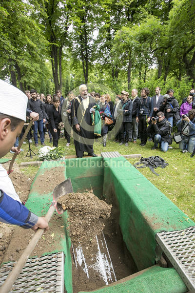 Die Toten Kommen - Aktion vom " Zentrum für politische Schoenheit ". Bestattung von Menschen / Fluechtlingen, die beim Versuch Europa zu erreichen auf bzw. im Mittelmeer gestorben sind, in Berlin. Freitag 19. Juni 2015, die zweite oeffentliche berliner Bestattung auf dem evangelischen Alten 12 Apostel Friedhof, Schoeneberg, durch den Imam Abdallah Hajjir. Beerdigt wird ein 60 jaehriger syrischer Palaestinenser, Vater von vierzehn Kindern, der sein Krebsleiden in Europa behandeln lassen wollte und auf der Ueberfahrt durch Schlepper auf dem Mittelmeer gestorben ist. No model release. Copyright: david baltzer/bildbuehne.de.
