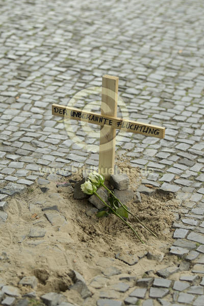 " Marsch der Entschlossenen " - " Die Toten Kommen " - Aktion vom " Zentrum für politische Schoenheit ". Demonstration und angekuendigte Bestattung von Menschen / Fluechtlingen, die beim Versuch Europa zu erreichen auf bzw. im Mittelmeer gestorben sind vor dem berl. Bundeskanzleramt, Berlin. Sonntag 21. Juni 2015. No model release. Copyright: david baltzer/bildbuehne.de. Hier Demonstrationszug Unter den Linden und Kundgebung vor dem Bundeskanzleramt. Nach dem offiziellen Ende der Demonstration wird der Zaun vor dem Reichsttag nieder gedrueckt und die Menge versammelt sich dortselbst auf dem Rasen. Es werden symbolische Graeber ausgehoben und inszeniert. Hier ' wildes ' Grab auf einem berliner Buergersteig.