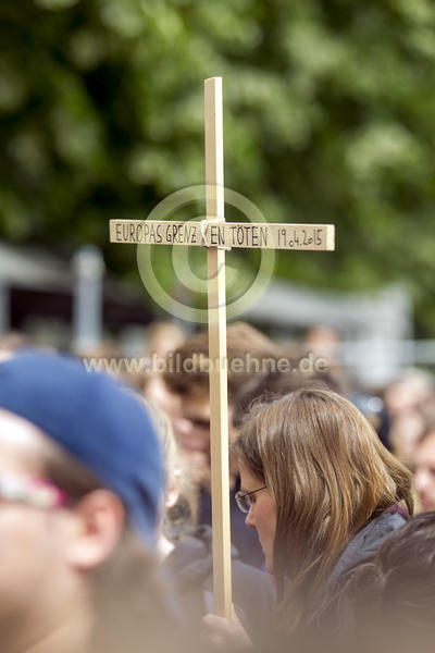 " Marsch der Entschlossenen " - " Die Toten Kommen " - Aktion vom " Zentrum für politische Schoenheit ". Demonstration und angekuendigte Bestattung von Menschen / Fluechtlingen, die beim Versuch Europa zu erreichen auf bzw. im Mittelmeer gestorben sind vor dem berl. Bundeskanzleramt, Berlin. Sonntag 21. Juni 2015. No model release. Copyright: david baltzer/bildbuehne.de. Hier Demonstrationszug Unter den Linden und Kundgebung vor dem Bundeskanzleramt, die Teilnehmer fuehren Blumen und Kreuze mit sich.
