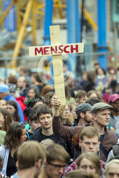 " Marsch der Entschlossenen " - " Die Toten Kommen " - Aktion vom " Zentrum für politische Schoenheit ". Demonstration und angekuendigte Bestattung von Menschen / Fluechtlingen, die beim Versuch Europa zu erreichen auf bzw. im Mittelmeer gestorben sind vor dem berl. Bundeskanzleramt, Berlin. Sonntag 21. Juni 2015. No model release. Copyright: david baltzer/bildbuehne.de. Hier Demonstrationszug Unter den Linden und Kundgebung vor dem Bundeskanzleramt, die Teilnehmer fuehren Blumen und Kreuze mit sich.