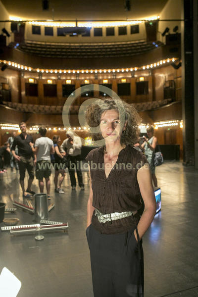 Titel: Auftaktpressekonferenz von der 27. Ausgabe von Tanz im August, Mittwoch, 12. August 2015. No model release. Copyright: david baltzer/bildbuehne.de. Hier die Intendantin vom HAU Annemie Vanackere auf der Buehne des HAU 1 u.a..