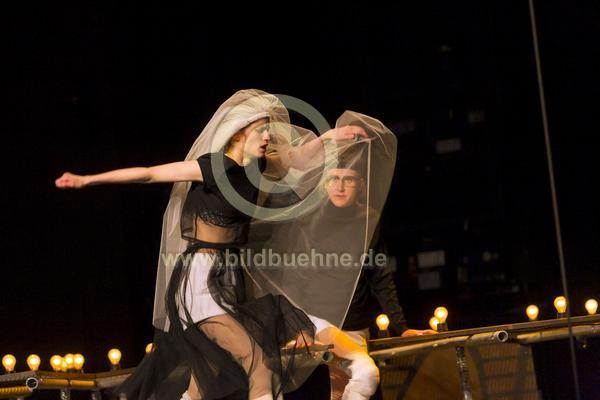 Titel: Die juristische Unschaerfe einer Ehe. Autorin: Olga Grjasnowa. Regie: Nurkan Erpulat. Buehne: Kathrin Frosch. Kostueme: Pieter Bax. Video: Sebastian Pircher. Choreographie: Nir de Volff. Ort: Maxim Gorki Theater Berlin. Urauffuehrung: 24. Oktober 2015. No model release. Copyright: david baltzer/bildbuehne.de. Darsteller: Lea Draeger als Lea und Mareike Beykirch u.a..