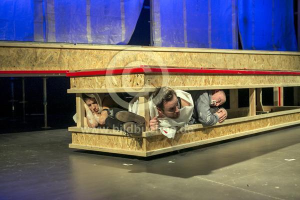 Titel: Kriegerin. Nach dem Film von David Wendt, bearbeitet fuer die Buehne von Tina Mueller. Regie: Robert Neumann. Buehne & Video: Silke Pielsticker. Kostueme: Jan A. Schroeder. Ort: Grips Theater Berlin. Urauffuehrung: 11. November 2015. No model release. Copyright: david baltzer/bildbuehne.de. Darsteller: Alessa Kordeck / Niku, Paul Jumin Hoffmann / Jamil, Rene Schubert / Oliver / Clemens, Regine Seidler / Warda / Bea / Kachel und Christian Giese / Amidou u.a..