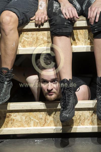 Titel: Kriegerin. Nach dem Film von David Wendt, bearbeitet fuer die Buehne von Tina Mueller. Regie: Robert Neumann. Buehne & Video: Silke Pielsticker. Kostueme: Jan A. Schroeder. Ort: Grips Theater Berlin. Urauffuehrung: 11. November 2015. No model release. Copyright: david baltzer/bildbuehne.de. Darsteller: Lorris Andre Blazejewski / Rasul u.a..
