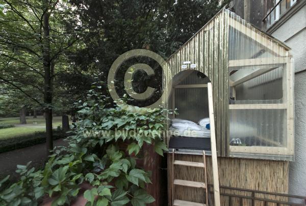 Titel: Hotel Berlin. Konzept und Regie: Recherchepraxis Nolte Feindel Brodowsky. Aust.: Hendrik Scheel. Film: Ute Schall. Ort: Ballhaus Ost. Urauffuehrung: 7. September 2016. Copyright: david baltzer / bildbuehne.de. Eins von 75 Betten, hier aussen an der Mauer zum Friedhof.