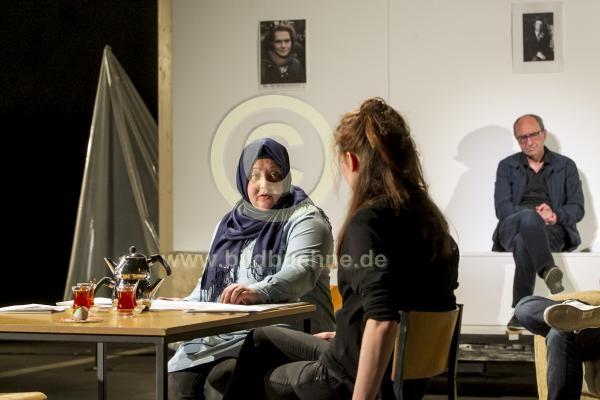 Titel: Istanbul. Regie und Autor: Nuran David Calis. Buehne: Anne Ehrlich. Kostueme: Amelie von Buelow. Video: Karnik Gregorian. Licht: Jan Steinfatt. Ort: Schauspiel Koeln im Carlswerk, Depot 2. Urauffuehrung: 13. Mai 2017. No model release. Copyright: david baltzer/bildbuehne.de. Spieler*Innen: Ayfer Sentuerk Demir, Ines Marie Westernstroeer und Dogan Akhanli u.a..