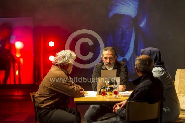 Titel: Istanbul. Regie und Autor: Nuran David Calis. Buehne: Anne Ehrlich. Kostueme: Amelie von Buelow. Video: Karnik Gregorian. Licht: Jan Steinfatt. Ort: Schauspiel Koeln im Carlswerk, Depot 2. Urauffuehrung: 13. Mai 2017. No model release. Copyright: david baltzer/bildbuehne.de. Spieler*Innen: Ismet Bueyuek, Kutlu Yurtseven, Dogan Akhanli, Ayfer Sentuerk Demir und Sean McDonagh (Video) u.a..