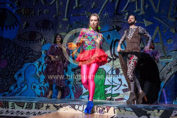 Ort: Maxim Gorki Theater, Berlin. Titel: Roma Armee. Autor: Yael Ronen und Ensemble. Regie: Yael Ronen. Buehne: Heike Schuppelius. Kostueme: Delaine Le Bas, Malerei/Artwork: Damaine Le Bas, Delaine Le Bas. UA: 14.09.17 Darst.: Simonida Selimovic, Riah May Knight, Lindy Larsson. Copyright: Marcus Lieberenz/bildbuehne.de (Veroeffentlichung nur gegen Honorar und Belegexemplar!)