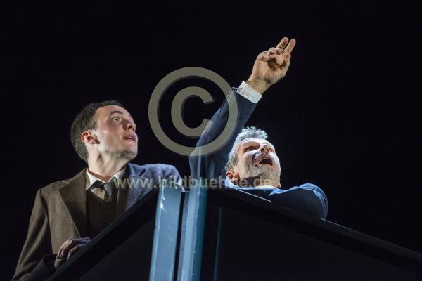 Ort: Deutsches Theater, Berlin. Titel: Amerika. Autor: Franz Kafka. Regie & Buehne: Dusan David Parizek. Kostueme: Kamila Palivkova. Premiere: 27.09.17 Darst.: Marcel Kohler (Karl Rossmann), Ulrich Matthes (Onkel Jakob/Oberkellner Isbary/Personalchef). Copyright: Marcus Lieberenz/bildbuehne.de (Veroeffentlichung nur gegen Honorar und Belegexemplar!)