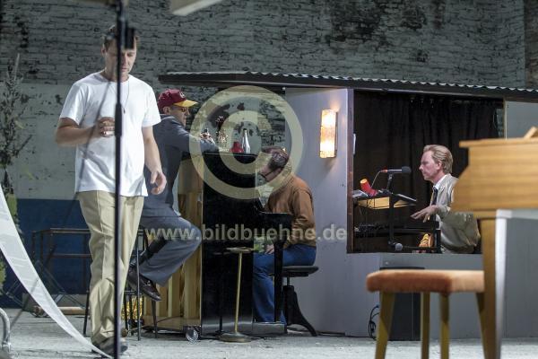 Titel: On the road. Autor: frei nach Jack Kerouac. Regie: David Marton. Buehne: Amber Vandenhoeck, David Marton. Kostueme: Pola Kardum. Licht: Henning Streck. Ort: Kammer 1 der Muenchner Kammerspiele. Urauffuehrung: 28. September 2017. No model release. Copyright: david baltzer/bildbuehne.de. Spieler*Innen: Thomas Schmauser, Paul Brody, Michael Wilhelmi und Daniel Dorsch u.a..