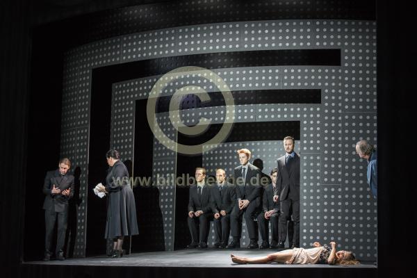 Ort: Komische Oper berlin. Titel: Pelleas et Melisande. Autor: Claude Debussy. Musikal. Leitung: Jordan de Souza. Inszenierung: Barrie Kosky. Buehne und Licht: Klaus Gruenberg. Kostueme: Dinah Ehm. Premiere: 15.10.17 Darst.: Guenther Papendell (Golaud, li.), Nadine Weissmann (Genevieve, 2.v.re.), Samuli Taskinen (Ein Arzt, Stimme des Hirten, 3.v.li.), Nadja Mchantaf (Melisande, 2.v.li.), Jens Larsen (Arkel, li.). Copyright: Marcus Lieberenz/bildbuehne.de (Veroeffentlichung nur gegen Honorar und Belegexemplar!)