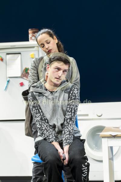Titel: Anton machts klar. Autorin: nach Milena Baischs Roman, Buehnenbearbeitung: Boris Pfeiffer und Ruediger Wandel, auch Regie. Musiktexte: Volker Ludwig. Buehne: Mathias Fischer-Dieskau. Kostueme: Marie Landgraf. Ort: Grips Theater Berlin. Urauffuehrung: 18. Januar 2018. No model release. Copyright: david baltzer/bildbuehne.de. Spieler*In: Patrik Cieslik / Anton und seine Muitter Katja Hiller / Sandra u.a..