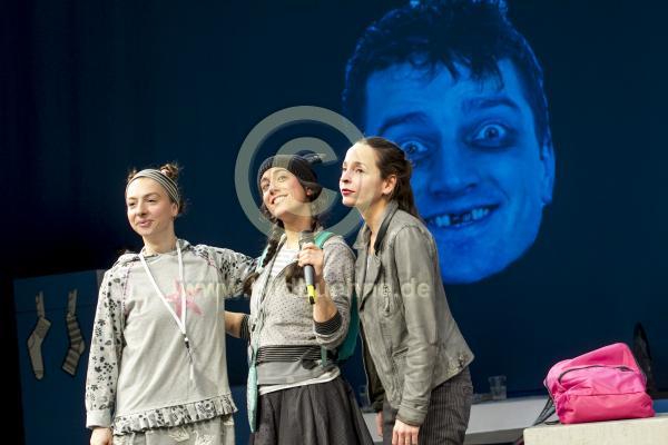 Titel: Anton machts klar. Autorin: nach Milena Baischs Roman, Buehnenbearbeitung: Boris Pfeiffer und Ruediger Wandel, auch Regie. Musiktexte: Volker Ludwig. Buehne: Mathias Fischer-Dieskau. Kostueme: Marie Landgraf. Ort: Grips Theater Berlin. Urauffuehrung: 18. Januar 2018. No model release. Copyright: david baltzer/bildbuehne.de. Spieler*In: Amelie Koeder / Xiaomeng, Nina Reithmeier / Fanny und Katja Hiller / Sandra, Patrik Cieslik / Anton u.a..