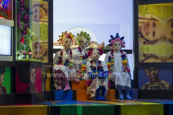 Titel: Die Selbstmord-schwestern / The virgin suicides. Autor: nach dem Roman von Jeffrey Eugenides. Regie: Susanne Kennedy. Buehne: Lena Newton. Kostueme: Teresa Vergho. Video: Rodrik Biersteker. Licht: Stephan Mariani. Kooperation mit den Kammerspielen Muenchen, Urauffuehrung: 30. Maerz 2017. Berlinpremiere in der Volksbuehne: 15. Maerz 2018. No model release. copyright: david baltzer/bildbuehne.de. Spieler*Innen: Damian Rebgetz, Christian Loeber, Walter Hess und Hassan Akkouch u.a.