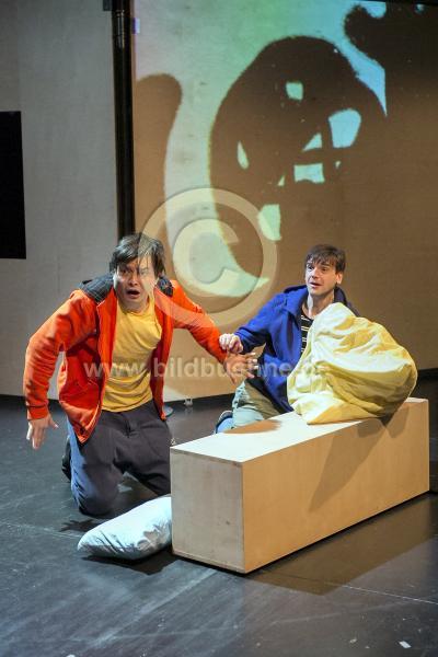 Titel: Magdeburg hiess frueher Madagaskar. Autor: Zoran Drvenkar. Regie: Frank Panhans. Buehne / Kostueme: Jan A. Schroeder. Video: Silke Pielsticker. Grips Theater im Podewil. Urauffuehrung: 21. Maerz 2018. No model release. copyright: david baltzer/bildbuehne.de. Spieler*Innen: Frederic Phung / Frankie und Jens Mondalski / Lars u.a..