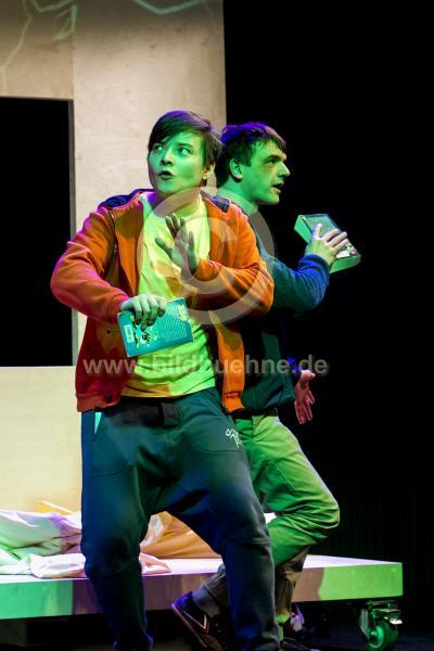 Titel: Magdeburg hiess frueher Madagaskar. Autor: Zoran Drvenkar. Regie: Frank Panhans. Buehne / Kostueme: Jan A. Schroeder. Video: Silke Pielsticker. Grips Theater im Podewil. Urauffuehrung: 21. Maerz 2018. No model release. copyright: david baltzer/bildbuehne.de. Spieler*Innen: Frederic Phung / Frankie und Jens Mondalski / Lars u.a..