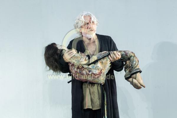 Titel: Siegfrieds Erben. Autoren: Feridun Zaimoglu und Guenter Senkel. Regie: Roger Vontobel. Buehne: Palle Steen Christensen. Kostueme: Nina von Mechow. Video: Clemens Walter. Licht: Ulrik Gad. Dramaturgie: Thomas Laue. Komposition: Keith O'Brien und Matthias Herrmann. Ort: Freiluftbuehne am Kaiserdom Worms. Urauffuehrung: 20. Juli 2018. No model release. copyright: david baltzer/bildbuehne.de. Spieler*Innen: Juergen Prochnow / Etzel und Ortlieb (Kinderpuppe) u.a..