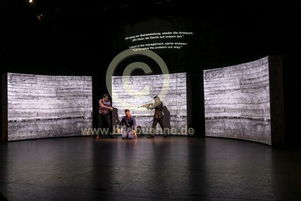 Titel: The Factory. Text: Mohammad Al Attar. Regie: Omar Abusaada. Ausst. Buehne: Bissane Al Charif. Video: Rami Farah, Samer Ajouri. Licht: Denise Potratz. Ort: Ruhrtriennale, Pact Zeche Zollverein Essen. UA: 11. August 2018. Berlin Volksbuehne: 17. September 2018. Schauspielerinnen: Saad Al Ghefari / Amre, Mustafa Kur / Ahmad und Ramzi Choukair / Firas u.a.. No model release. copyright: david baltzer/bildbuehne.de.