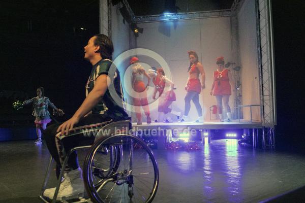 Titel: Cheer out Loud !. Autorin: Susanne Lipp. Regie und Fassung: Robert Neumann. Buehne: Georg Burger. Kostueme: Florence Klotz, Vanessa Vadineanu. Dramaturgie: Ute Volknant. Ort: Grips Theater. Urauffuehrung: 17. Januar 2019. No model release. Spieler*Innen: Frederic Phung / Alex und Ensemble: Lisa Klabunde / Jana, Lorris Andre Blazejewski / Dominik, Regine Seidler / Ricarda, Rachel Rosen / Martina, Carina Kuehne / Leonie, Max Edgar Freitag / Vater, Luisa-Charlotte Schulz / Mutter und Christian Giese / Hausmeister / Vater u.a..