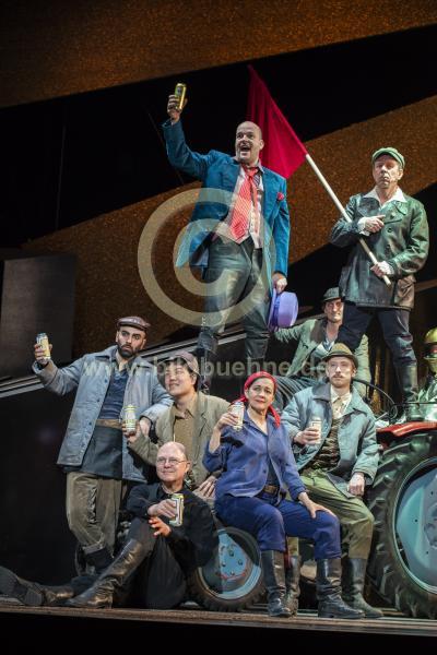 Ort: Deutsches Theater Kammerspiele, Berlin. Titel: Die Umsiedlerin. Autor: Heiner Mueller. Regie: Tom Kuehnel, Juergen Kuttner. Buehne: Jo Schramm. Kostueme: Daniela Selig. Premiere: 06.04.19 Darst.: Felix Goeser (Beutler, o.li.), Joerg Pose (Flint, o.re.), Bernd Stempel (Ketzer, Kupka, u.), Almut Zilcher (Flinte 1, Beutlern, Landrat, u.M.). Copyright: Marcus Lieberenz/bildbuehne.de (Veroeffentlichung nur gegen Honorar und Belegexemplar!)