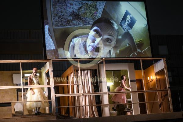 Ort: Volksbuehne Berlin. Titel: Germania. nach Heiner Mueller. Regie: Claudia Bauer. Buehne: Andreas Auerbach. Kostueme: Patricia Talacko. Musik: Mark Scheibe. Premiere: 17.10.19. Mit: Malick Bauer, Katja Gaudard. Copyright: Marcus Lieberenz/bildbuehne.de (Veroeffentlichung nur gegen Honorar und Belegexemplar!)