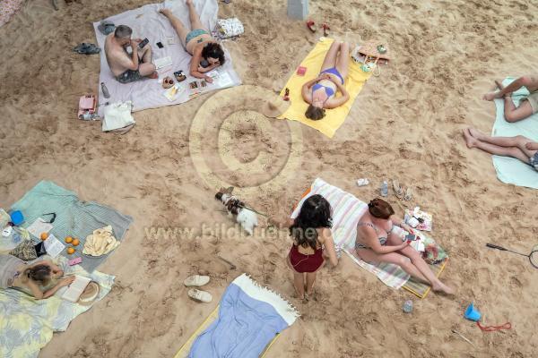 Titel: Sun & Sea (Marina). Konzept / Regie: Rugile Barzdziukaite, Vaiva Grainyte und Lina Lapelyte. No model release. Spieler*Innen: Austėja Masliukaitė, Jenni Lee Jones und Enrico Zagni, Kalliopi Petrou, Justina Mykolaityte, Susan Proctor, Marco Cisco und Lucas Lopes Pereira u.a.. Der Litauische Pavillon gewinnt mit dieser special edition fuer Venedig den Goldenen Loewen 2019. 58. Biennale Arte von Venedig.