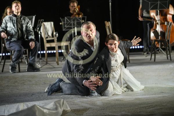 Ort: Deutsches Theater Kammerspiele, Berlin. Titel: jedermann (stibt). Autor: Ferdinand Schmalz. Regie: Data Tavadze. Buehne & Kostueme: Janja Valjarevic. Premiere: 01.03.2020 Darst.: Paul Grill (die (teuflisch) gute Gesellschaft, dicker Vetter), Joerg Pose (Jedermann), Lorena Handschin (Jedermanns Frau, Jedermanns Mutter). Live-Musik: Lukas Growe (Kontrabass), Daniel Casimir (Posaune), Gerhard Gschloessl (Posaune), Samuel Dunscombe (Klarinette). Copyright: Marcus Lieberenz/bildbuehne.de (Veroeffentlichung nur gegen Honorar und Belegexemplar!)
