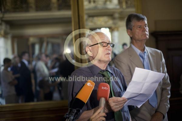 Der Dramatiker, Autor und Regisseur Rolf Hochhuth gibt eine Pressekonferenz im Berliner Ensemble. Es geht uA um seine, bzw die der Ilse-Holzapfel Stiftung Ansprueche an das Berliner Ensemble. Hinter ihms ein Anwalt Uwe Lehmann-Brauns. Donnerstag 19. August 2009. No model release.
