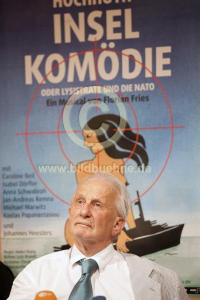 Rolf Huchhuth auf der Pressekonferenz anlaesslich der Urauffuehrung - Inselkomoedie oder Lysistrate und die Nato - von Rolf Hochhuth und Florian Fries im Berliner Ensemble am 30. Juli 2010. Hier Rolf Hochhuth vor dem Plakat der Produktion - Lysistrate reitet nackt auf einem Natokriegsschiff - Mittwoch 28. Juli 2010. No model release.