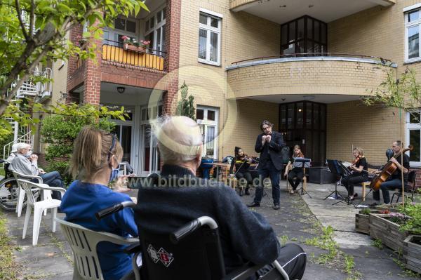 Ope(r)n air. SaengerInnen aus dem Ensemble sowie MusikerInnen aus dem Orchester der Deutschen Oper Berlin bringen Livemusik in kleinen Konzerten in Seniorenresidenzen und Pflegeeinrichtungen. Hier: Kammerkonzert im Lazarus Haus Berlin-Mitte. 20.05.2020. Copyright: Marcus Lieberenz/bildbuehne.de (Veroeffentlichung nur gegen Honorar und Belegexemplar!)