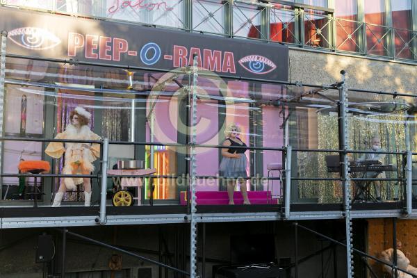 Titel: Fruehsommerlicher Depressioinszusammenhang (Eine Peepshow). Nach einem Text von Gerhild Steinbuch und Thomas Koeck. Regie: Lucia Bihler, Johanna Bantzer, Sarah Franke und Emma Roennebeck. Buehne: Ann-Christin Mueller und Mayan Tuulia Frank. Kostueme: Eleonore Carriere und Nina Lopac. Dramaturgie: Degna Martens. Ort: Hof am Roten Salon der Volksbuehne Berlin. Urauffuehrung: 24. Juni 2020. no model release. Spielerin: Jella Haase, Teresa Schergaut und Sir Henry, unten Katja Gaudard u.a..