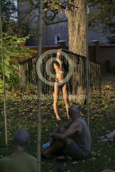 Titel: meantime. Regie und Asstg.: Toula Limnaios. Choreogr Assistenz: Ute Pliestermann. Licht: Felix Grimm. Ort: Halle. Urauffuehrung: 13. August 2020. Drei Orte, ein Parcour: Garten, Halle und Foyer. Tanz unter den Bedingungen der Corona Pandemie. no model release. Eroeffnungssolo von Alba e Miguel im Garten u.a..