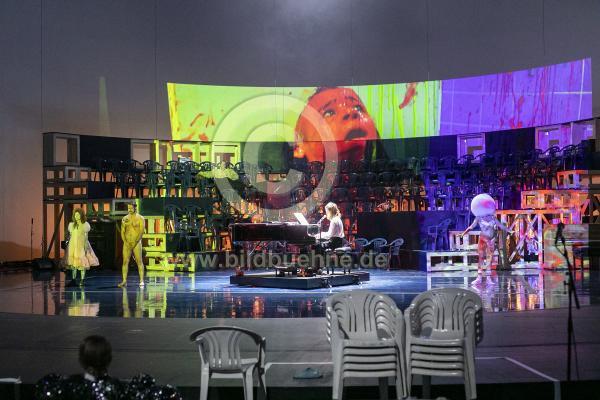 Titel: Die Orestie. Konzept und Regie: Thorleifur Oern Arnarsson, nach Aischylos. Buehne: Ann-Christine Mueller. Kostueme: Mona Ulrich. Video: Voxi Baerenklau. Licht: Kevin Sock. Dramaturgie: Ulf Froetzschner. Theater waehrend der Corona Pandemie mit Hygienekonzept und Abstandsregel. Ort: Volksbuehne Berlin. Urauffuehrung: 1. Oktober 2020. no model release. Spieler*Innen: Katja Gaudard / Kassandra, Daniel Nerlich / Agamemnon, Sarah Maria Sander am Fluegel, Solveig Arnarsdottir / Martha in der Projektion und Sylvana Seddig / Iphigenie u.a..