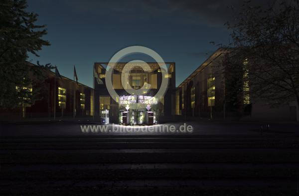 Deutschland, Berlin, Kanzleramt. Das Zentrum fuer politische Schoenheit hat vor dem Kanzleramt zwei Sammelcontainer - sowie angeblich drei weitere im Bundesgebiet - fuer gestohlene Waffen aus der Bundeswehr aufgestellt. Kampagnentitel: Wir suchen unsere Waffen. Hinweise auf die Waffen werden mit 1000 Euro Finderlohn belohnt. Die Aktion zielt auf Soldaten, die mit rechtsextremen Attentate planen und uA dem KSK angehoeren. Die No model and property release.
