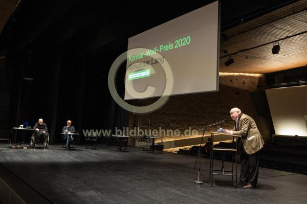 Akademie der Kuenste, Hanseatenweg. Konrad-Wolf-Preis 2020. Alexander Lang. Mit Alexander Lang, Volker Braun, Elisabeth Gaulhofer, Christian Grashof, Hans-Dieter Schuett, Klaus Voelker. 29.10.2020 Copyright: Marcus Lieberenz/bildbuehne.de (Veroeffentlichung nur gegen Honorar und Belegexemplar!)