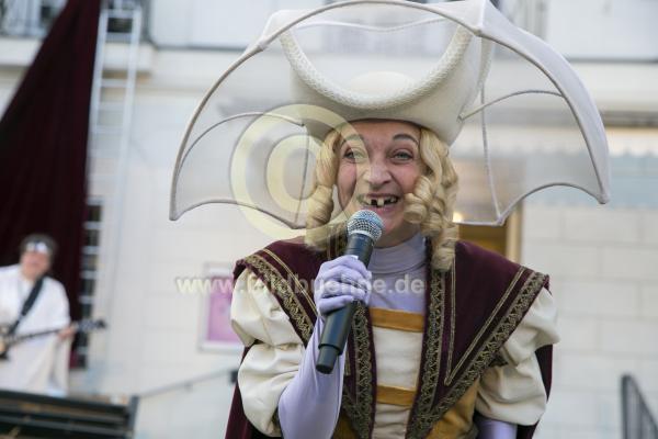 Titel: Tartuffe oder Das Schwein der Weisen. Autor: frei nach Moliere von Peter Licht. Regie: Jan Bosse. Buehne: Stephane Laime. Kostueme: Kathrin Plath. Licht: Marco Scherle. Dramaturgie: David Heiligers. Ort: Vorhof des Deutschen Theaters Berlin. Openairpremiere: 22. Mai 2021. no model release. Spielerin: Regine Zimmermann / Herr Frau Pernelle u.a.. Es ist die erste Premiere des dt Theaters am Ende des 2. Locksdowns. Theater unter den Bedingungen der Corona Pandemie mit Hygienekonzept und Abstandsregeln.