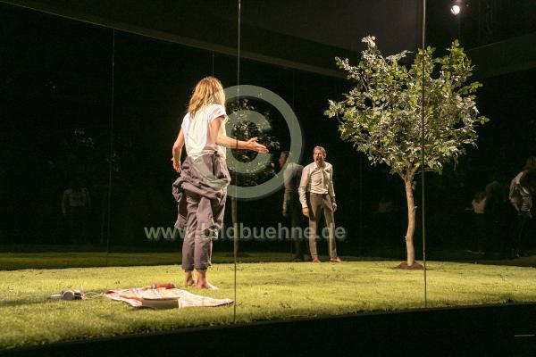 Titel: Yerma. Autor: Simon Stone nach Frederico Garcia Lorca. Buehne: Lizzie Clachan. Kostueme: Alice Babidge. Licht: James Farncombe. Dramaturgie: Nils Haarmann. Produktion des Young Vic Theatre London. Ort: Schaubuehne Berlin. Dt. Erstauffuehrung: 27. Juli 2021. no model release. SpielerInnen: Caroline Peters / Yerma und ihr Partner / Mann Christoph Gawenda / John steiten, sie soll nichts privates mehr ueber ihn in ihrem Blog veroeffentlichen u.a.. Hygienekonzept im Theater aufgrund der Corona Pandemie.