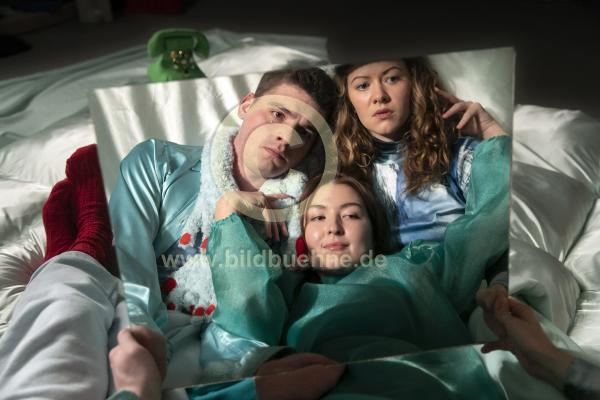 Titel: Selfie - ab 14 Jahre. Autorin: Christine Quintana. Regie: Maria Lilith Umbach. Buehne Kostueme: Lea Kissing. Kostueme: Merle Richter. Video: Alexander Richter. Dramaturgie: Tobias Diekmann. Ort: Grips Theater im Podewil. Premiere: 14. Januar 2022. no model release. SpielerInnen: Marius Lamprecht / Chris, Yana Ermilova / Lily und Lisa Klabunde / Emma u.a.. Vorabfoto, bitte nach der Premiere als solches kennzeichnen.