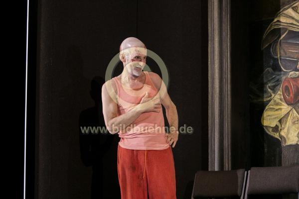 Titel: Der zerbrochene Krug. Autor: Heinrich von Kleist. Regie: Anne Lenk. Buehne: Judith Oswald. Kostueme: Sibylle Wallum. Licht: Cornelia Gloth. Dramaturgie: David Heiligers. Ort: Deutsches Theater Berlin. Premiere: 18. Dezember 2021. no model release. SpielerInnen: Ulrich Matthes / Dorfrichter Adam u.a.. Hygienekonzept im Theater aufgrund der Corona Pandemie.