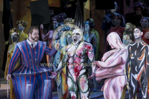 Titel: Antikrist. Komponist und Libretto: Rued Langgaard. Regie und Buehne: Ersan Mondtag. MusikLtg: Stephan Zilias. Kostueme: Ersan Mondtag, Annika Lu Hermann. Choreografie: Rob Fordeyn. Licht: Rainer Caspar. Dramaturgie: Lars Gebhardt, Carolin Mueller-Dohle. Chor: Jeremy Bines. Ort: Deutsche Oper Berlin. Premiere: 30. Januar 2022. no model release. SaengerInnen: Thomas Lehman / Luzifer, Jordan Shanahan / der Hass und Flurina Stucki / grosse Hure sowie Chor, TaenzerInnen u.a.. Hygienekonzept im Theater aufgrund der Corona Pandemie.