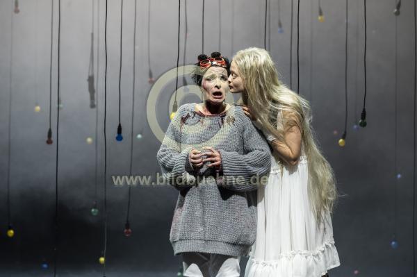 Ort: Berliner Ensemble. Titel: Draussen vor der Tuer. Autor: Wolfgang Borchert. Regie: Michael Thalheimer. Buehne: Olaf Altmann. Kostueme: Nehle Balkhausen. Premiere: 25.03.2022 Darst.: Kathrin Wehlisch (Beckmann, Der Andere), Philine Schmoelzer (Ein Maedchen). Copyright: Marcus Lieberenz/bildbuehne.de (Veroeffentlichung nur gegen Honorar und Belegexemplar!)